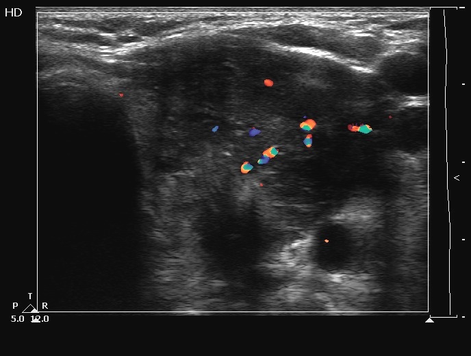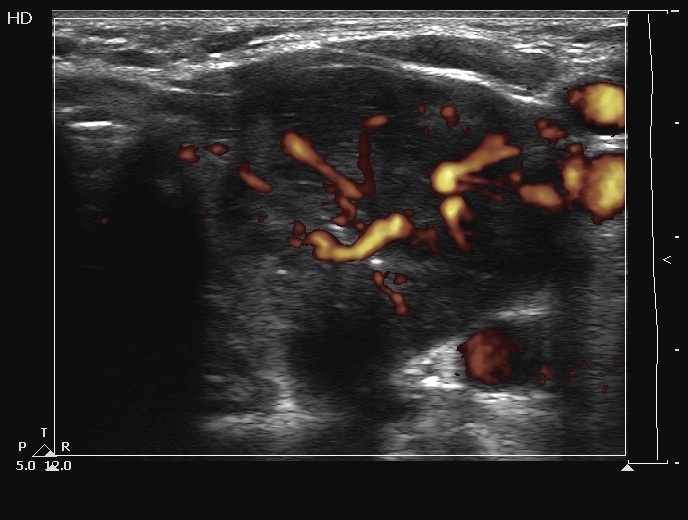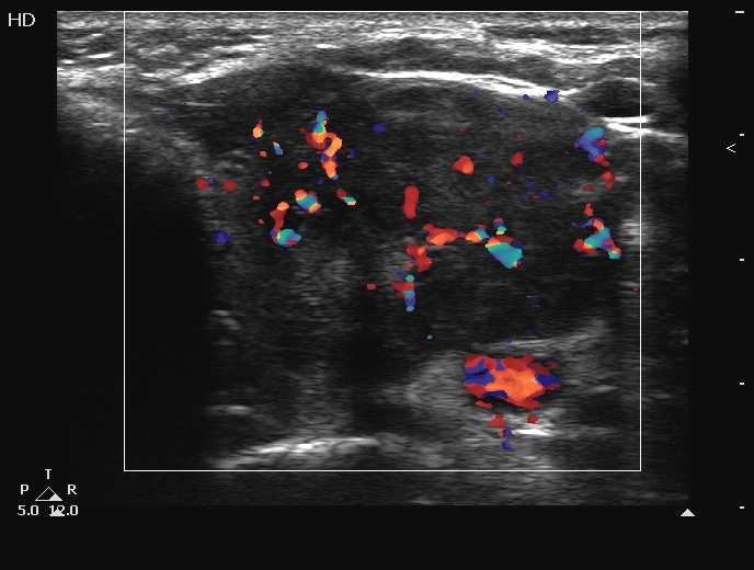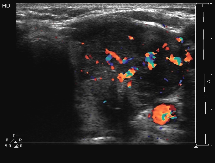 Ultrasonography. The thyroids were echonormal and contained several cystic areas and an echonormal nodule in the right lobe. There was a large partly echonormal, partly hypoechogenic nodule in the left thyroid. This lesion had irregular bordersr and presented an irregularly increased intranodular vascularization.