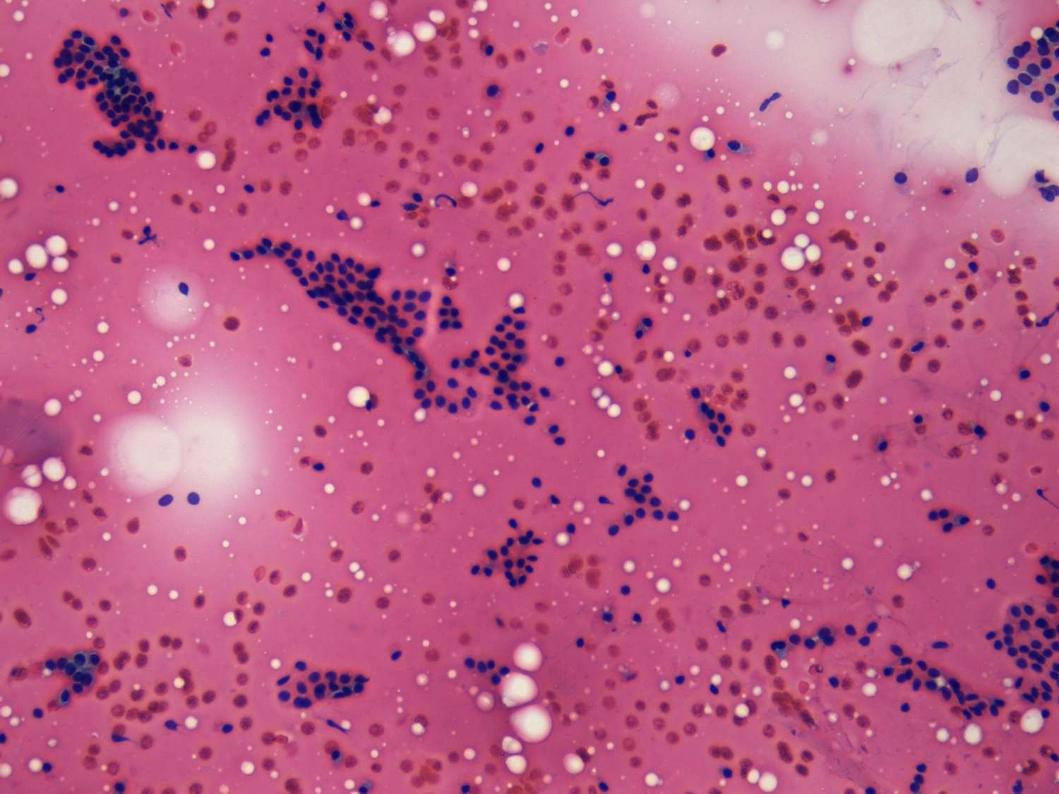 Pap-smear, 200x. Follicular cells are dissociated and in monolayered sheets.
