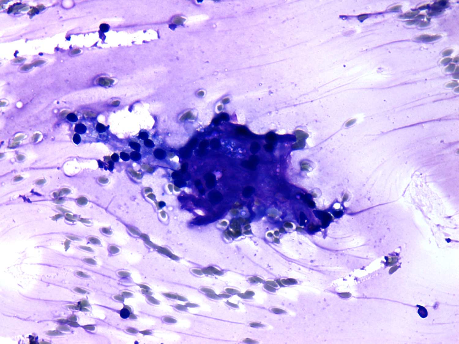 Wright-Giemsa staining, 400x. The picture demonstrates the so-called fire-flare appearance which is a specific sign of active hormone-producing disease.