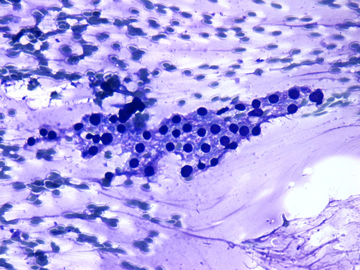 Wright-Giemsa staining, 400x. Cytoplasmic vacuolisation is a typical sign of hyperthyroidism.