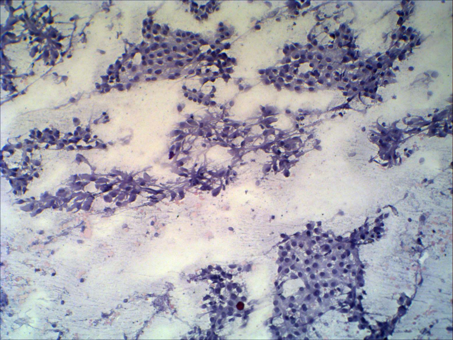 Pap-smear, 100x. There is no colloid in the background. Oxyphilic cell clusters are seen mixed with lymphocytes.