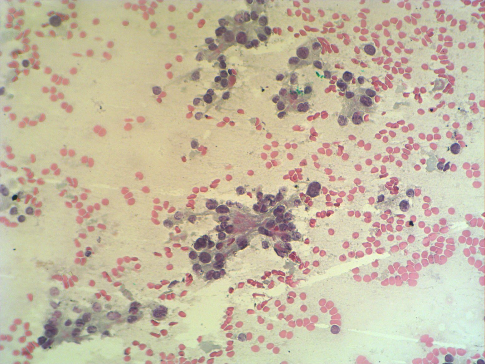 Pap-smear, 200x. Marked anisonucleosis is seen. The microfollicles are abortive.