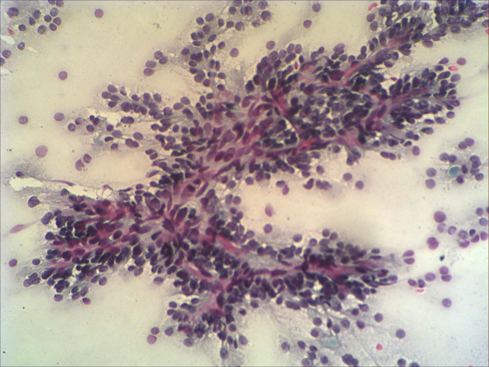 Pap-smear, 200x. An arborizing, trabecular structure with fibrovascular core.