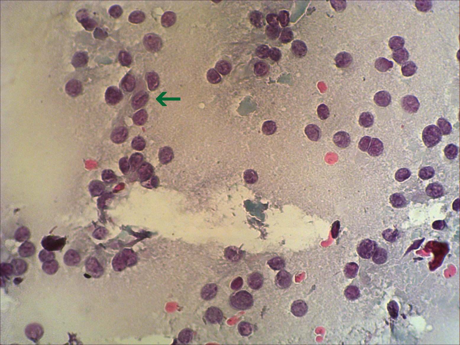 Pap-smear, 400x. Dispersed cells are presented in this image. There is a cell with a typical intranuclear groove (arrow).