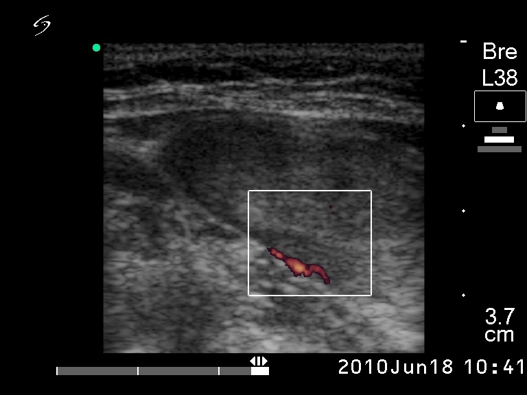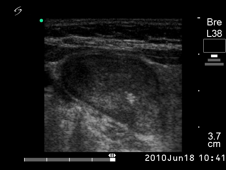 Ultrasonography: revealed a solitary hypoechogenic nodule with halo sign and perinodular blood flow.