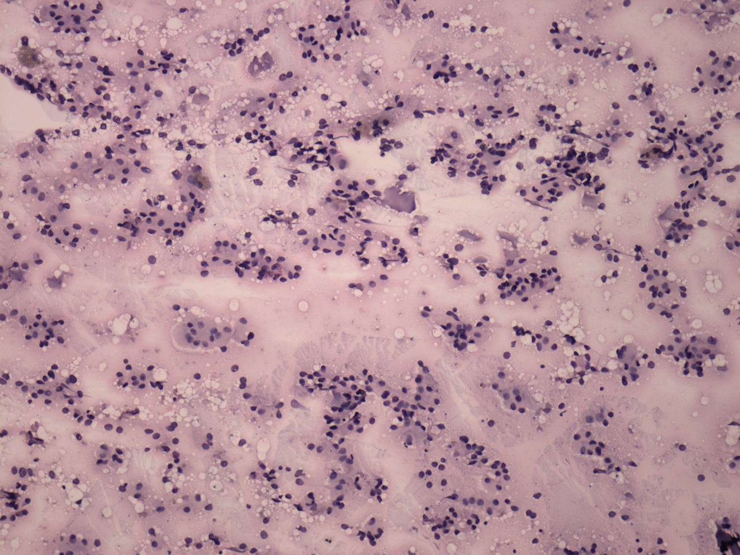 Pap-smear, 100x. A very cellular pattern can be seen in a diffuse colloidal background.