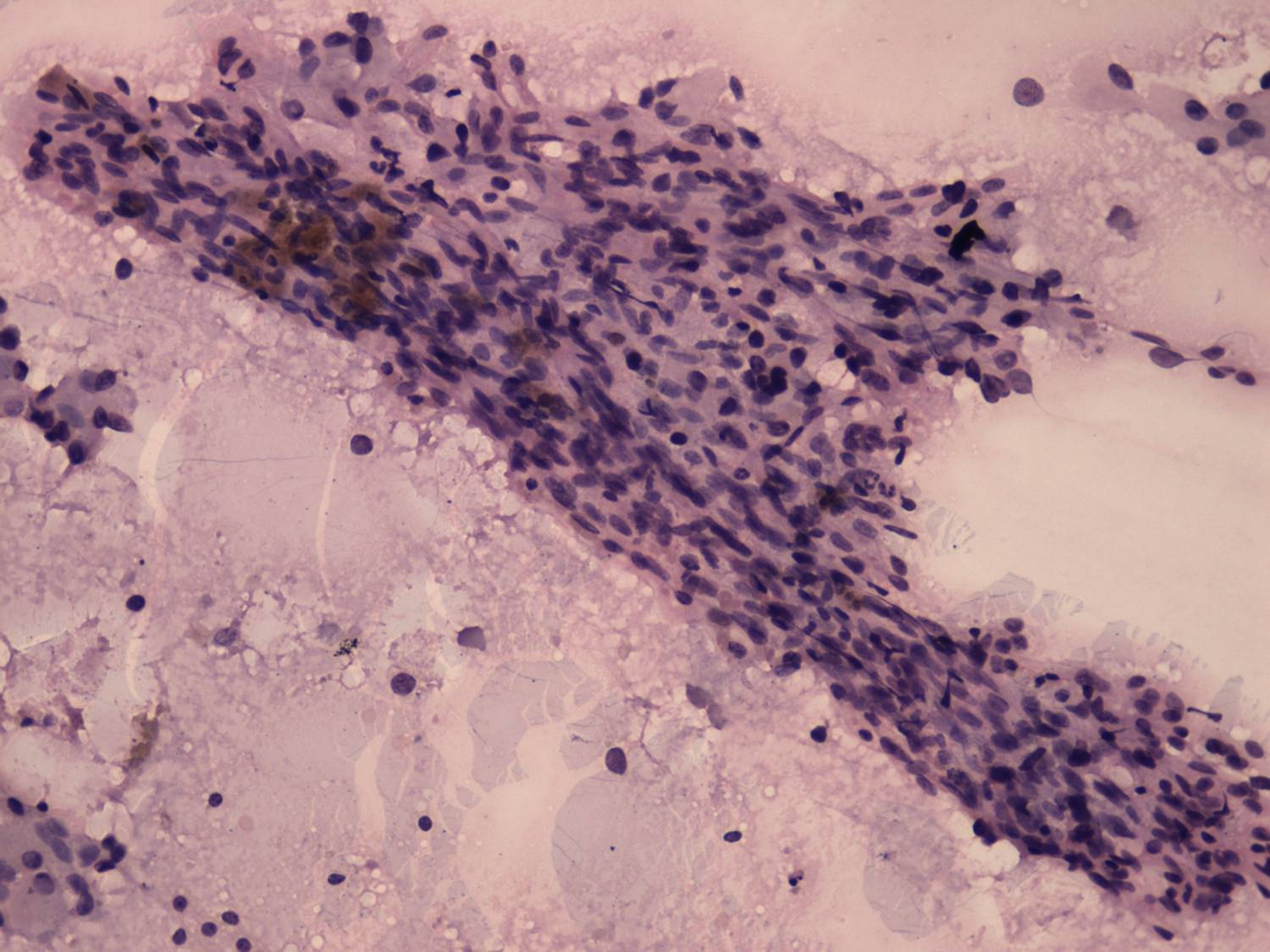 Pap-smear, 200x. A fragment of a papillary cluster. Note elongated fibrocytes and macrophages with brown pigments.