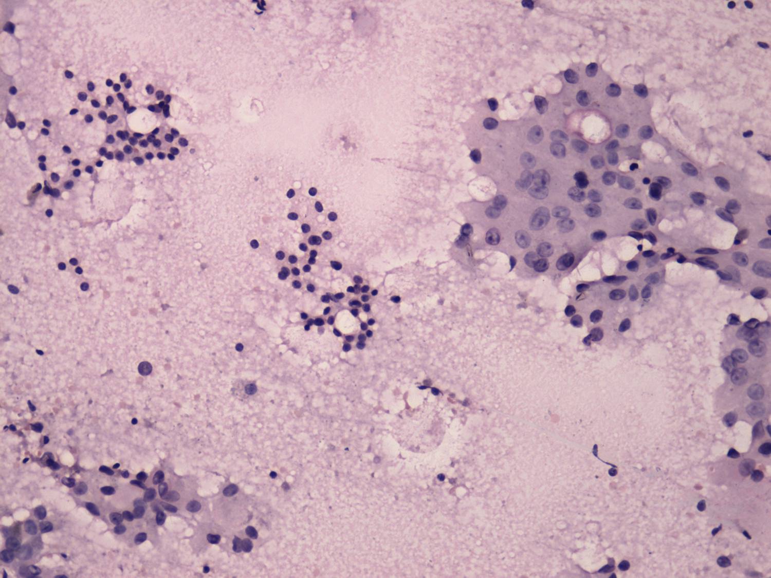 Pap-smear, 200x. Two different cell populations are demonstrated. The left lower and the right cluster is composed of cells presenting prominent nucleoli and abundant cytoplasm while the other two groups are composed of typical follicular cells.