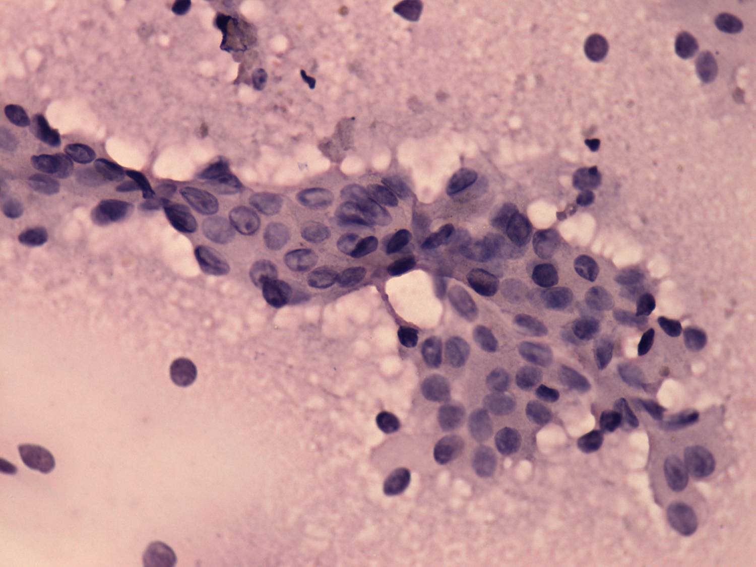 Pap-smear, 400x. Follicular cells present prominent nucleoli and occasionally grooves.