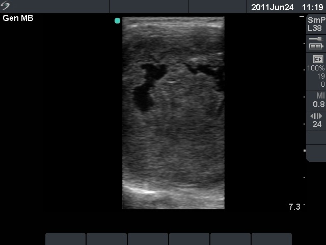 Ultrasonography: an extremely enlarged left thyroid which was composed of multiple hypoechogenic nodules. The dimensions of the left lobe were 150x180x350 mm.
