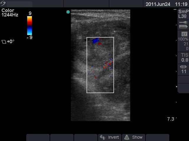Functional state: subclinical hyperthyroidism (TSH 0.09 mIU/L, FT4 15.7 pM/L, FT3 4.66 pM/L).