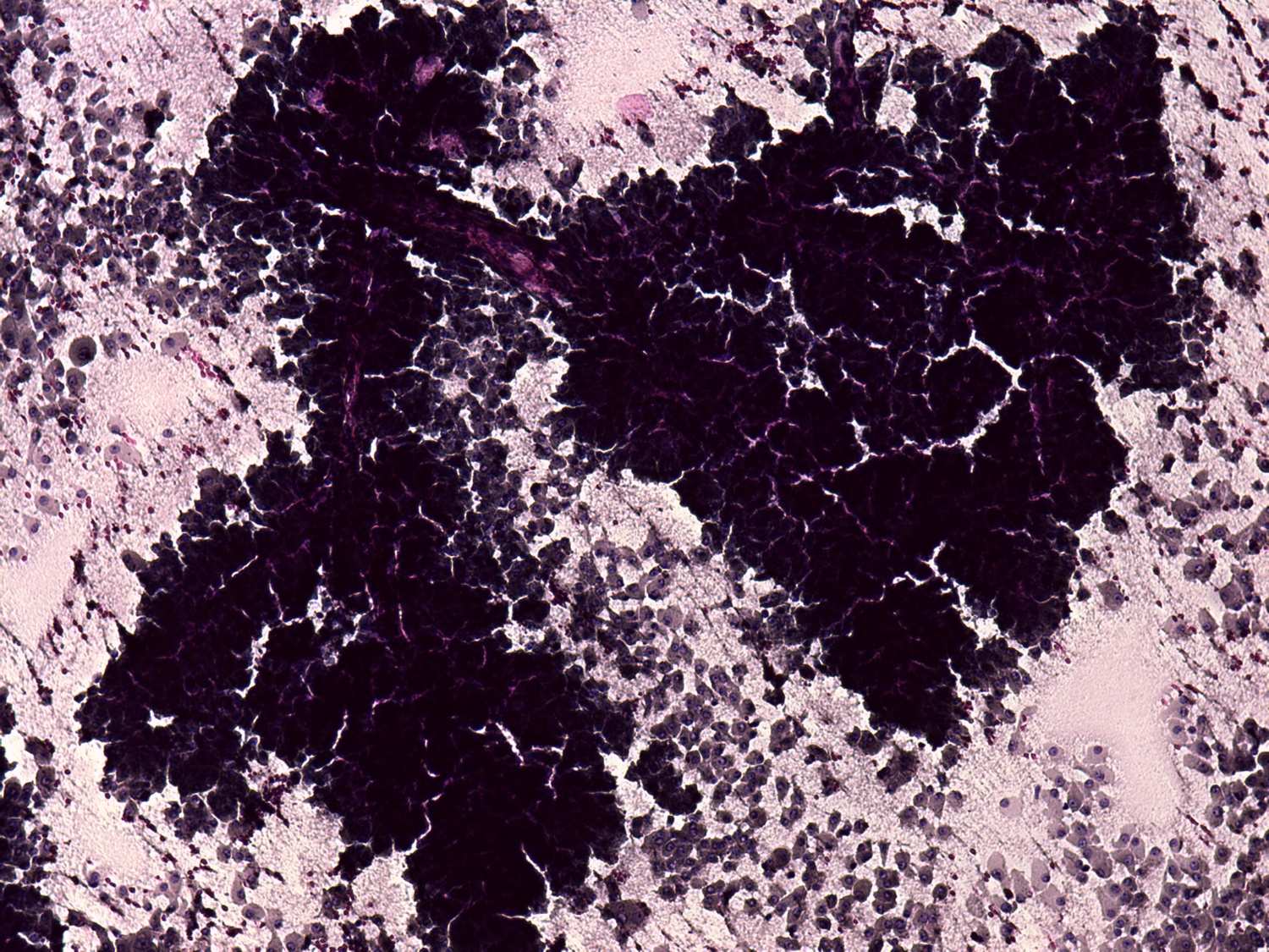 Pap-smear, 100x. Dissociated cells and a syncytial cluster.