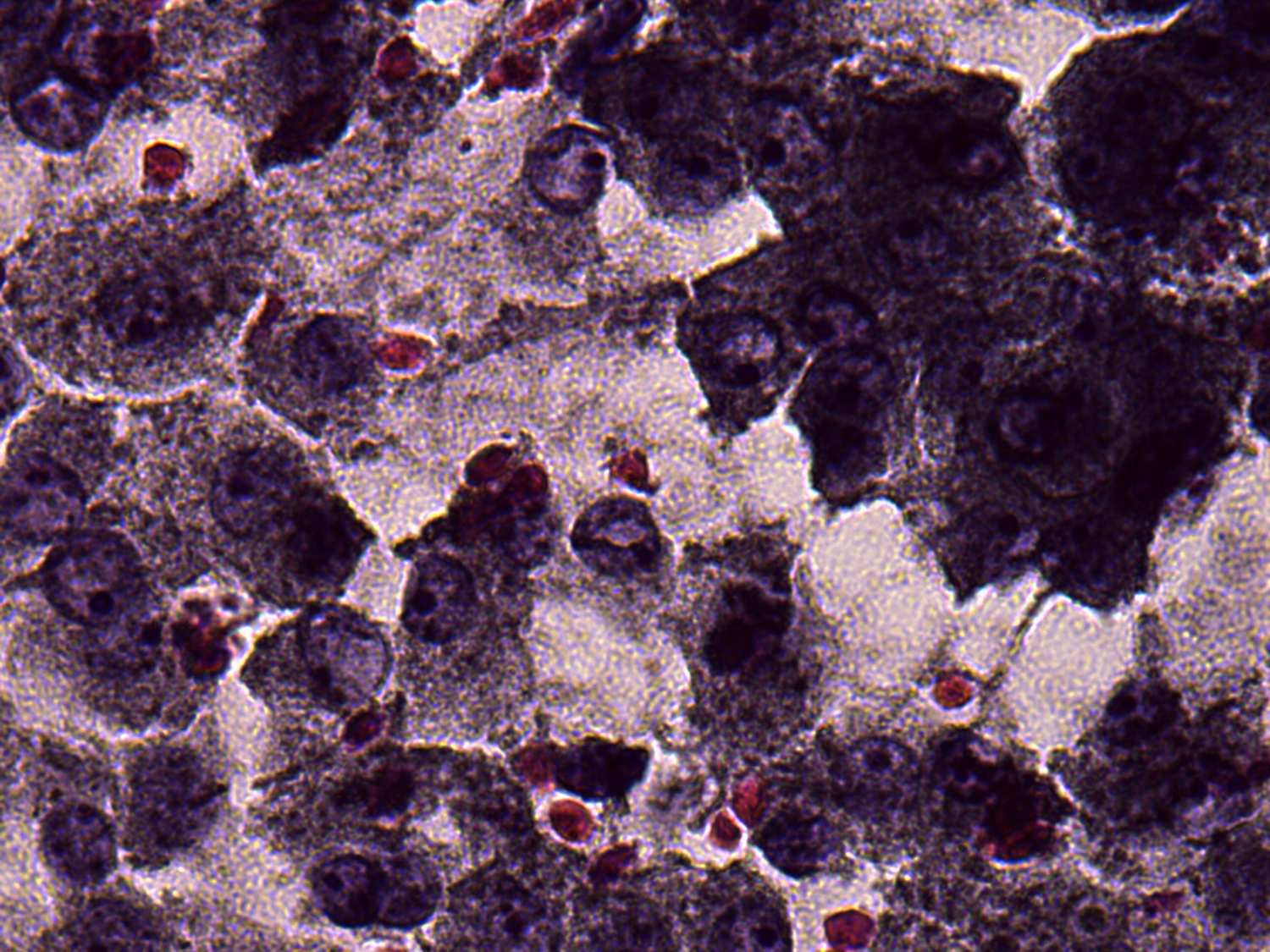 Pap-smear, 1000x. Follicular cells have clear nuclei and contain prominent nucleoli.