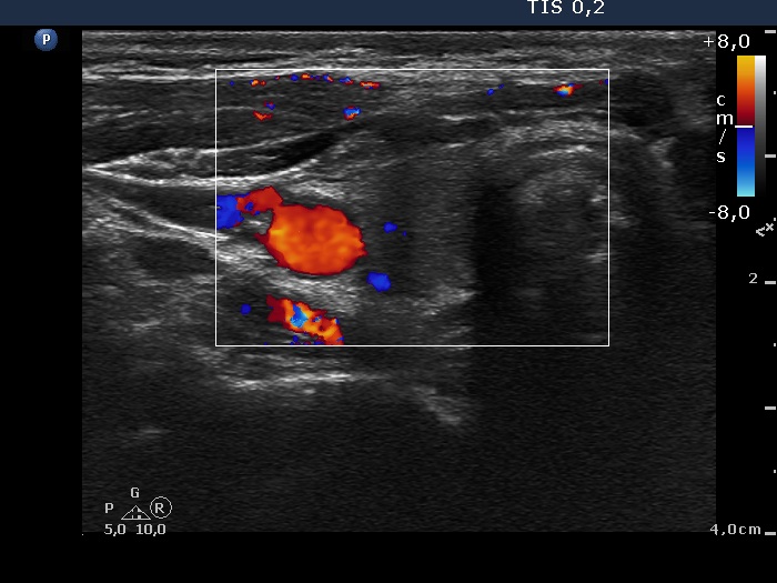 Right lobe, horizontal scan, color Doppler method. The vascularization is not specific.
