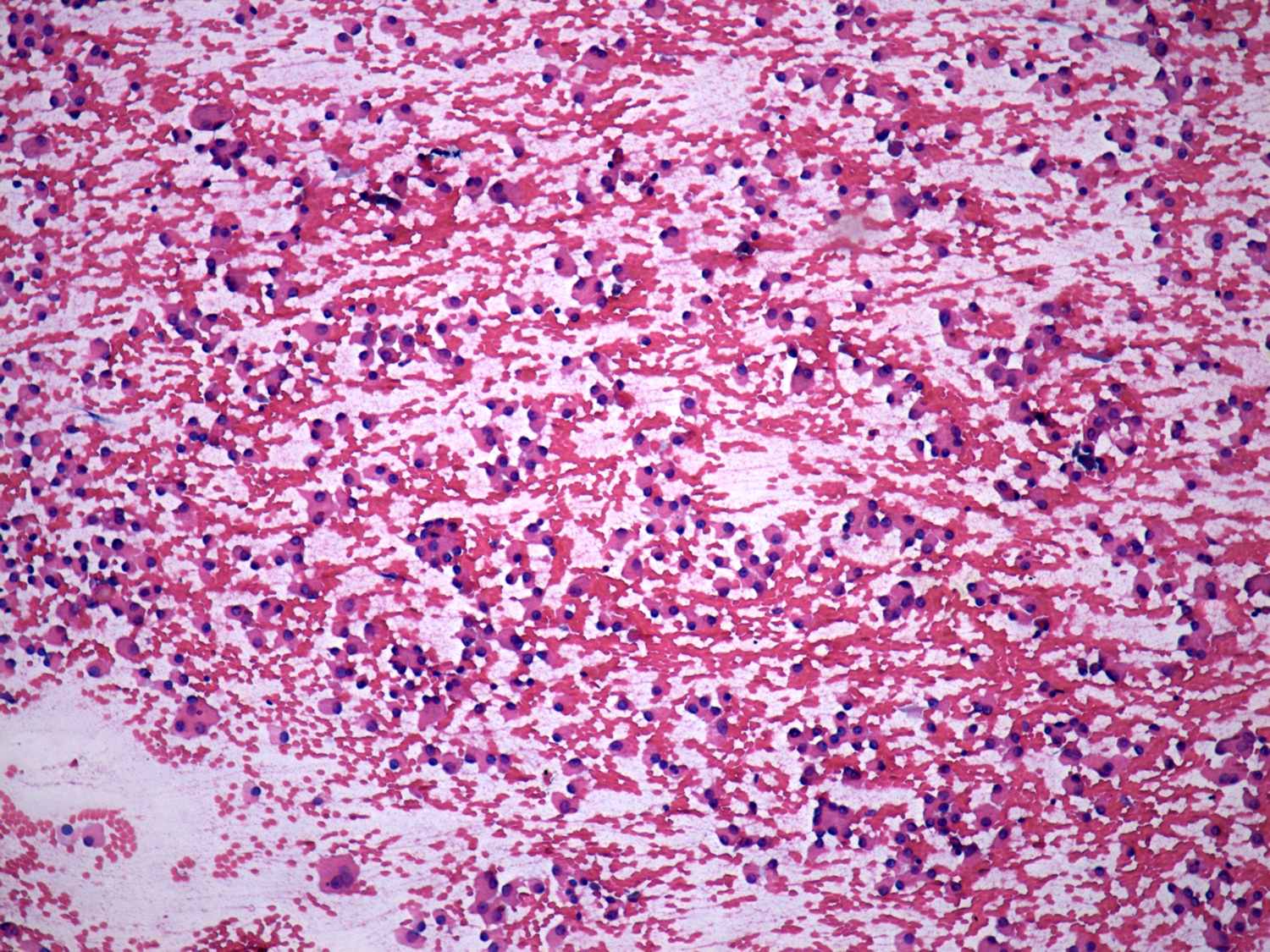 Pap-smear, 100x. There is no colloid in the background. A very cellular pattern composed of microfollicles and dispersed oxyphilic cells.