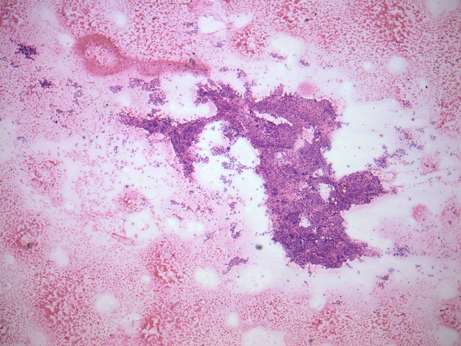 Pap-smear, 40x. There is no colloid in the background. A large cluster of follicular cells.