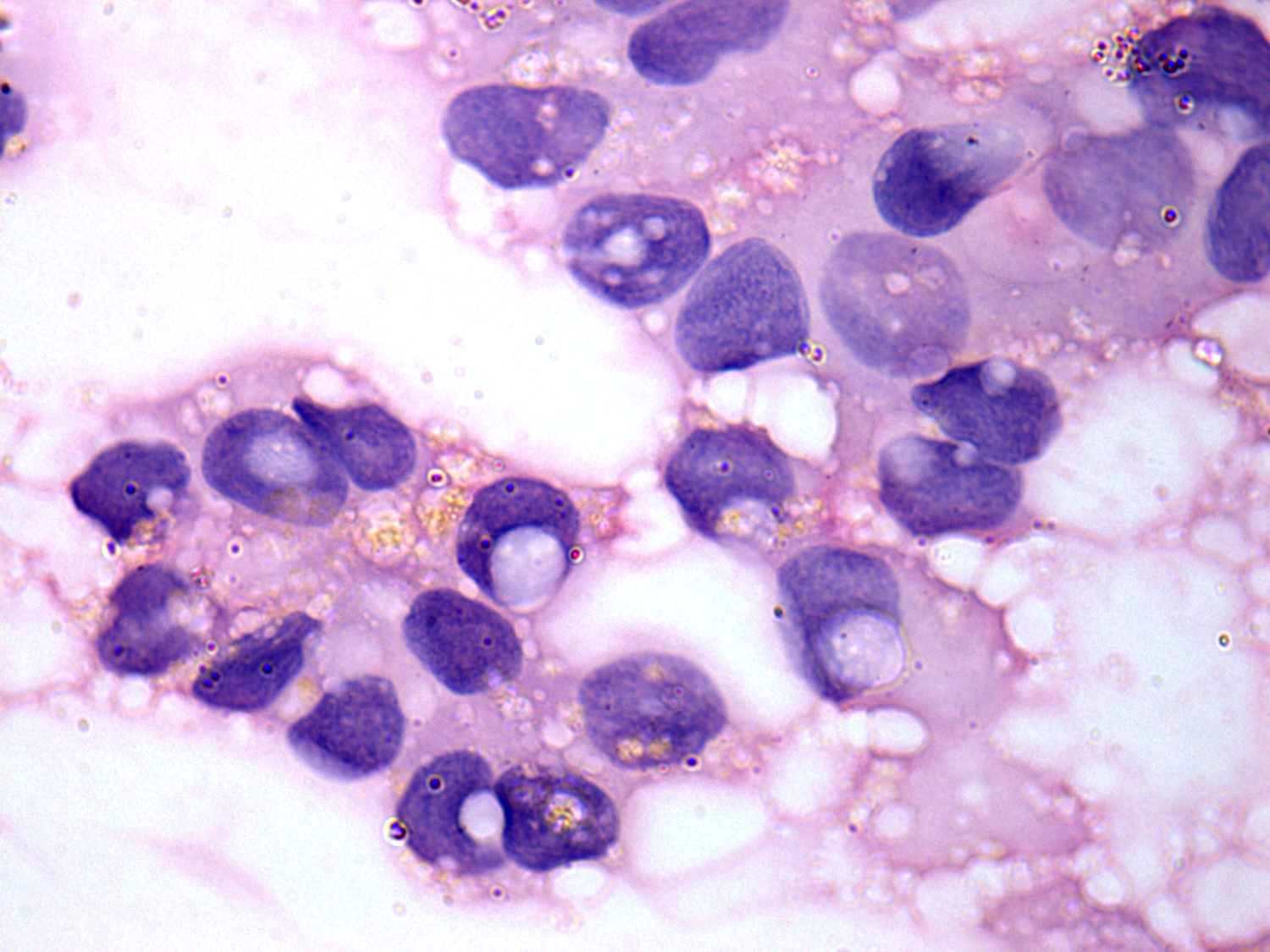 Pap-smear, 1000x. Most if not all of the intranuclear holes demonstrated in this image are only projections of extranuclear vacuoles.