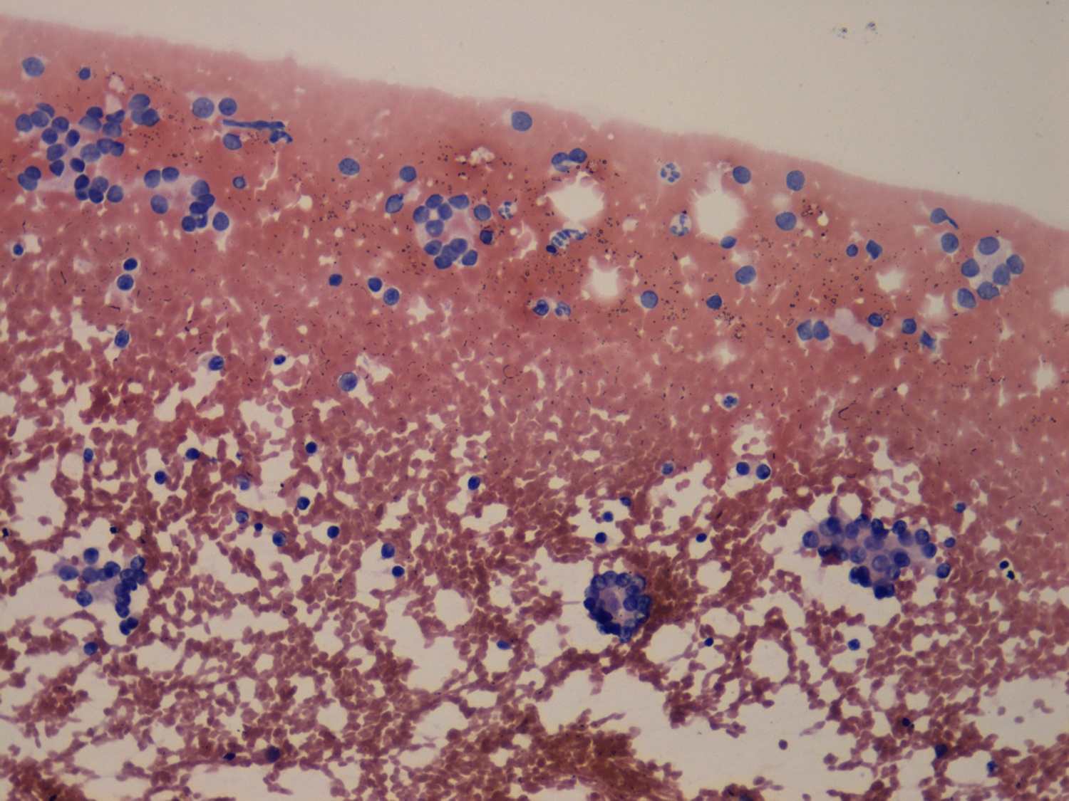 Pap-smear, 200x. Dispersed cells and microfollicles predominate the smear.