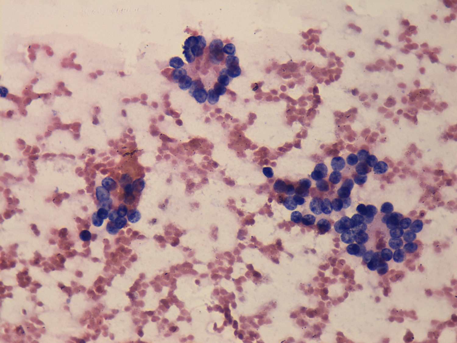 Pap-smear, 400x. This is a typical microfollicular proliferation. Follicular cells are of even size.
