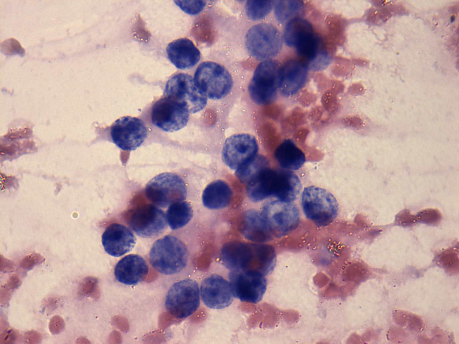 Pap-smear, 1000x. Follicular cells present prominent nucleoli, but otherwise there is no significant atypia present.