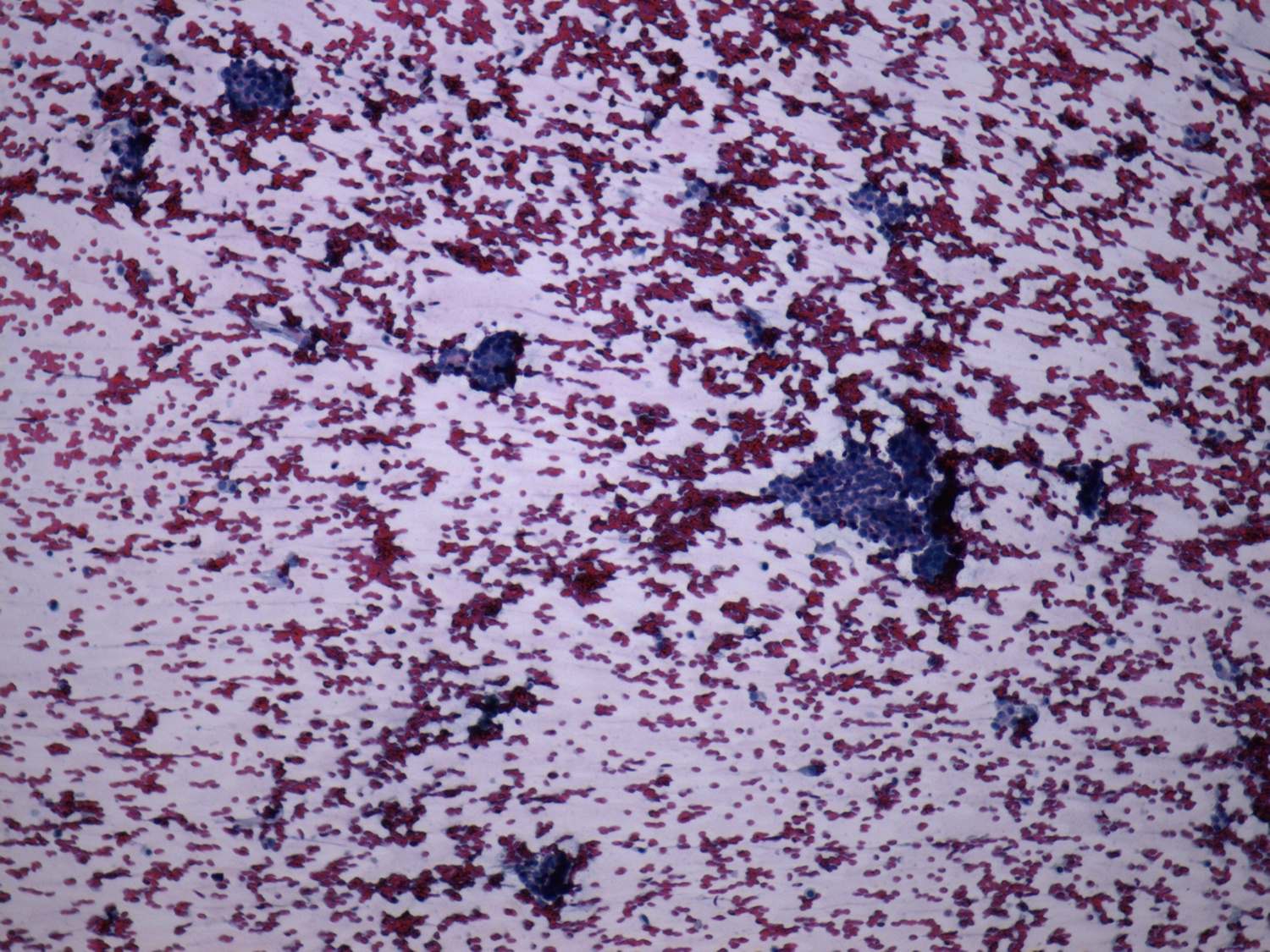 Pap-smear, 100x. There are papillary cell groups in a bloody background.