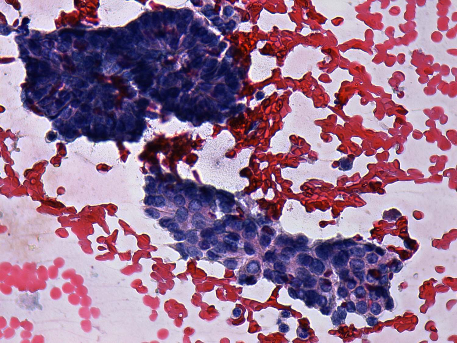 Pap-smear, 400x. Two atypical clusters with nuclear crowding and overlapping. Note an inclusion.