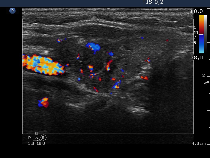 Left lobe, longitudinal scan, color Doppler mode. The intralesional vascularization is increased.