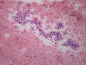 Cytology was performed from the largest hyperechogenic nodule in the left lobe. There was diffuse colloid precipitate in the background. Great proportion of follicular cells exhibited oxyphilic metaplasia. They were located in cohesive groups.