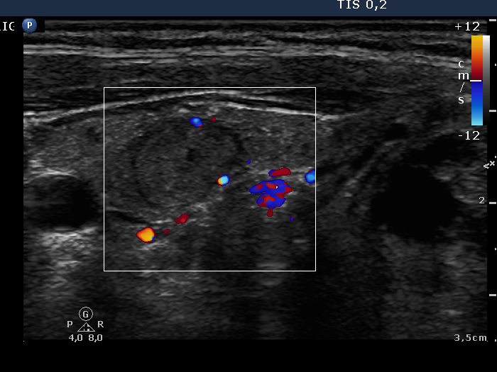 The echonormal lesion in the right thyroid is remarkable. It's ultrasound pattern is identical to the non-lesional part of the thyroid. There was no pathological finding corresponding to this lesion.