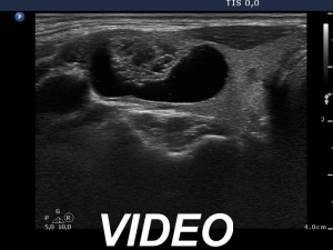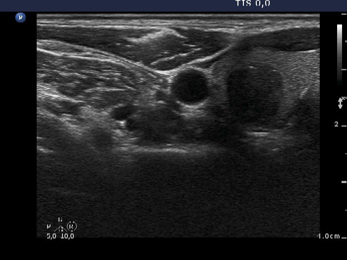 Ultrasonography. The thyroid was echonormal. There was a spongiform-type cyst in the right lobe. The small cystic areas of the lesion exhibited posterior back wall enhancement. The vascularization was scanty. Compared with the former examination, the nodule remained just as large. There was another nodule in the left lobe which was not described on previous ultrasound report. This lesion was hypoechogenic, presented hyperechogenic granules and showed taller-than-wide sign.