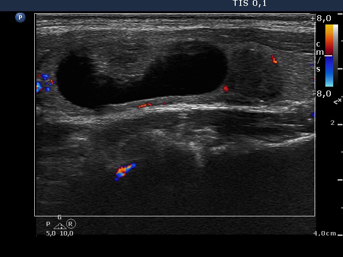 Comment. Note the typical presentation of posterior back wall enhancement.