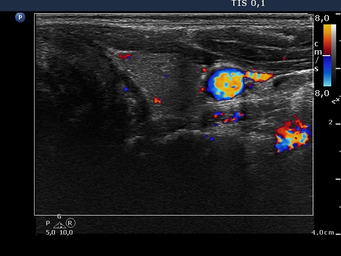 Left lobe, horizontal view, color Doppler mode. The vascularization is not specific.
