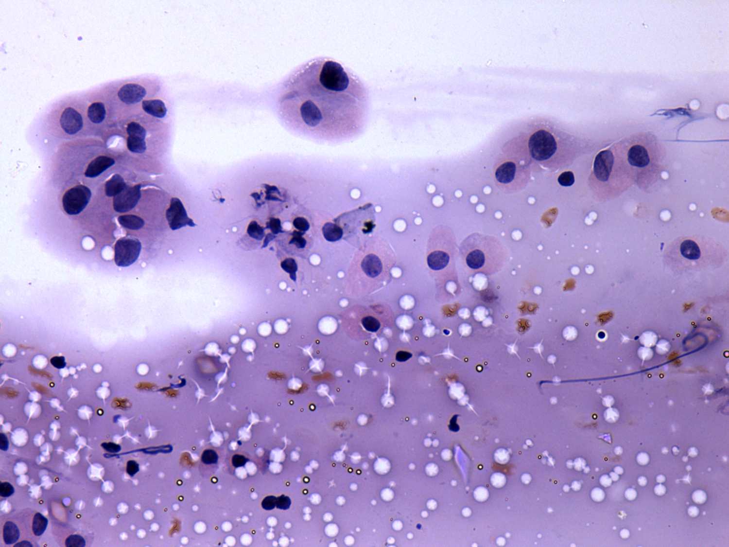 Pap-smear, 400x. Dispersed pycnotic cells and thyrocytes with oxyphilic metaplasia in thick colloidal background.