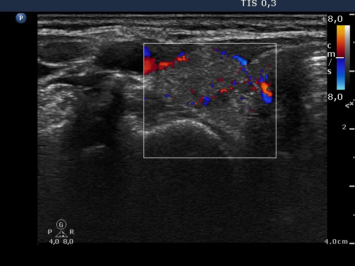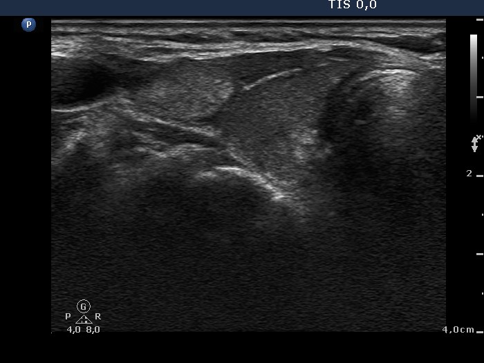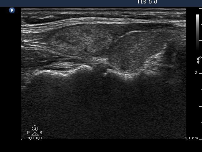Ultrasonography: the thyroids were moderately hypoechogenic. There was an echonormal, inhomogeneous mass next to the upper pole of the right lobe. Muscle fibers were found between the thyroid and the hyperechogenic lesion. The latter displayed type 2 vascular pattern.