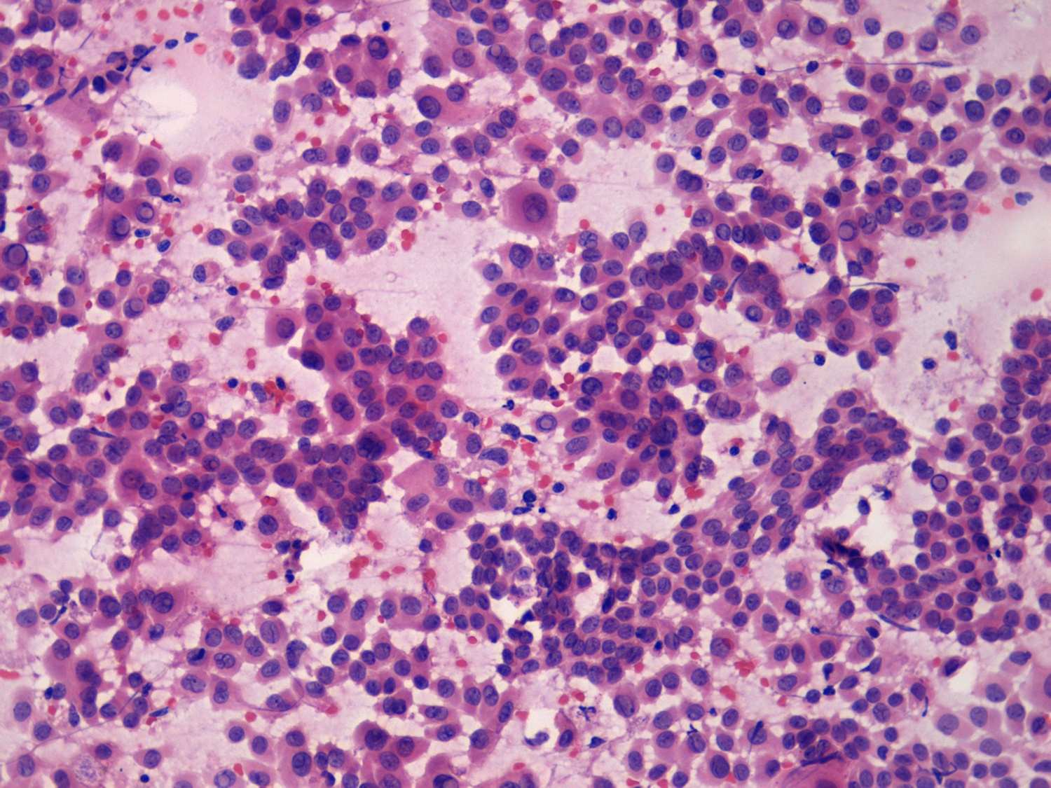 Pap-smear (intraoperative imprint), 200x. Follicular cells with abundant cytoplasm dispersed and forming microfollicles.