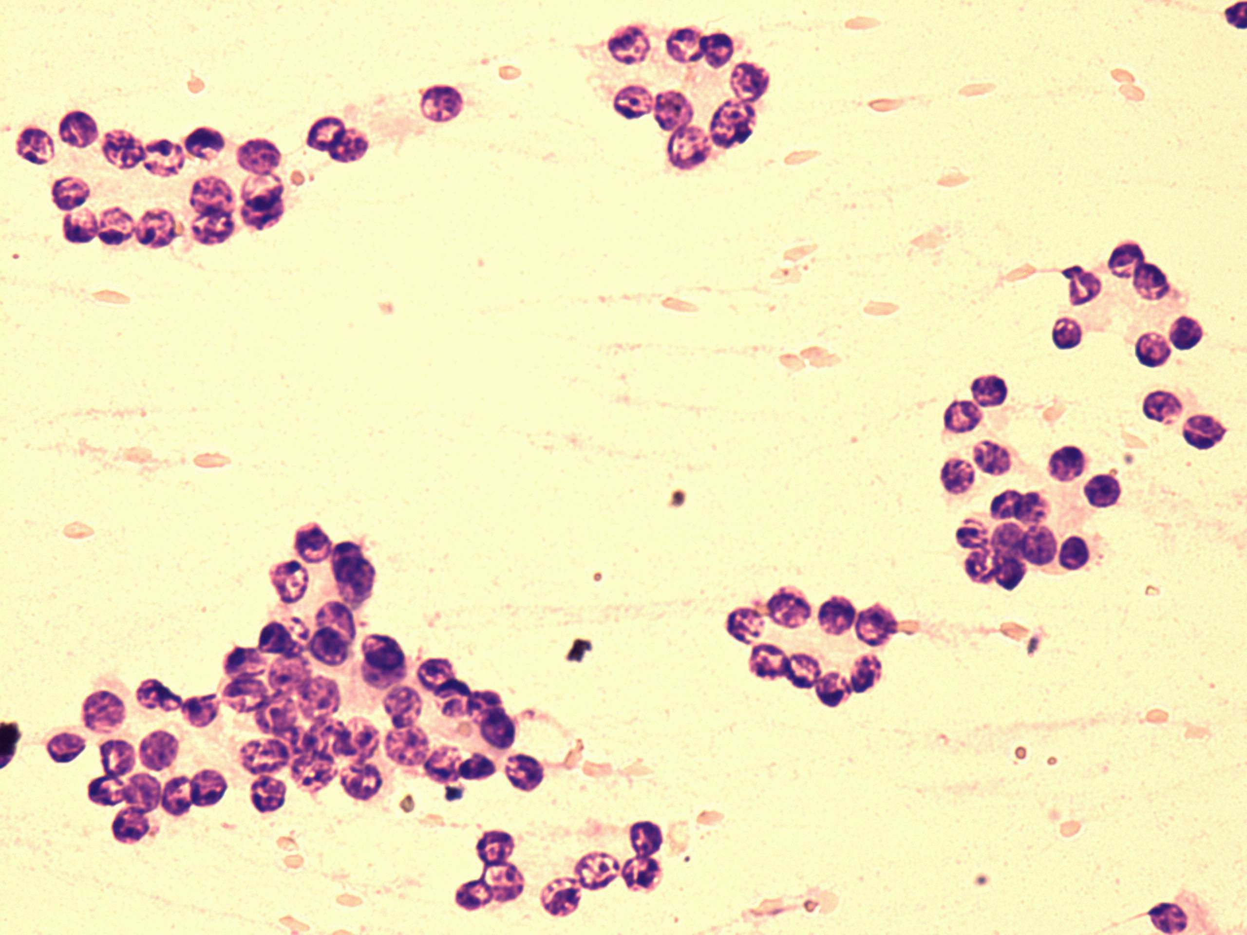 Wright-Giemsa staining, 400x. Follicular cells are of even size and display degenerative changes.