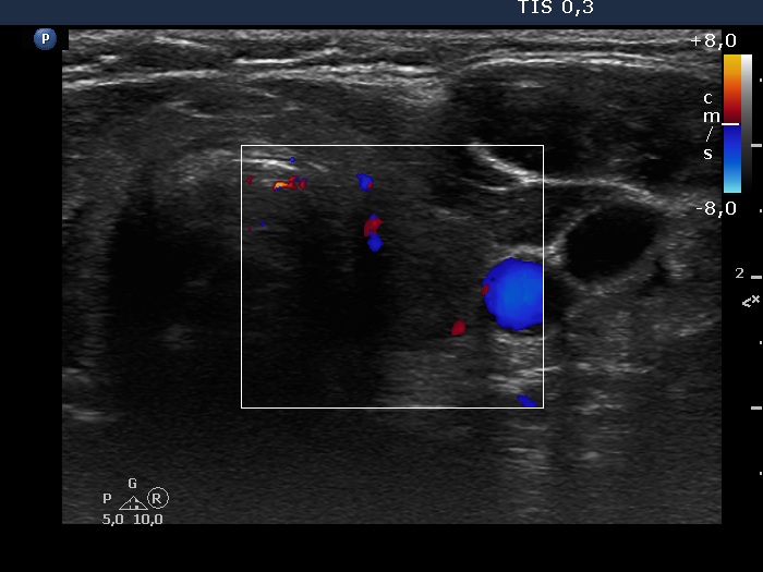 Ultrasonography revealed minimally-moderately hypoechogenic thyroid presenting more hypoechogenic areas. These corresponded to more active foci of Hashimoto's thyroiditis and not to nodules in a pathological sense.