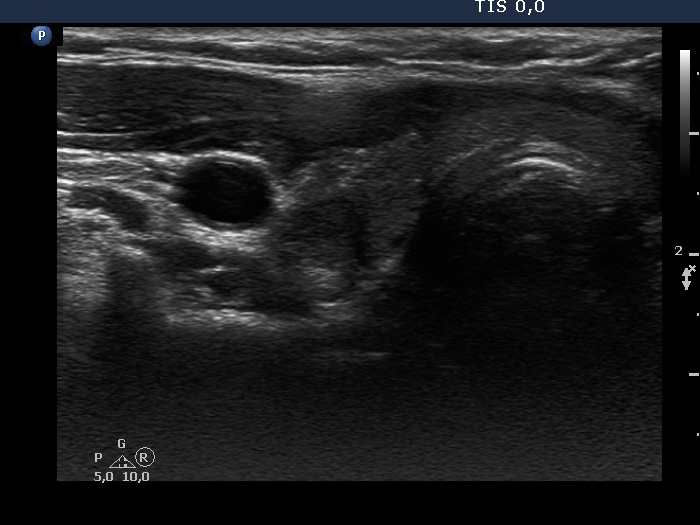 Lower part of the right lobe, horizontal scan. There is a more hypoechogenic area in the dorsolateral part of the thyroid.