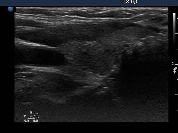 Left lobe, longitudinal scan. This lobe also contains more hypoechogenic areas.