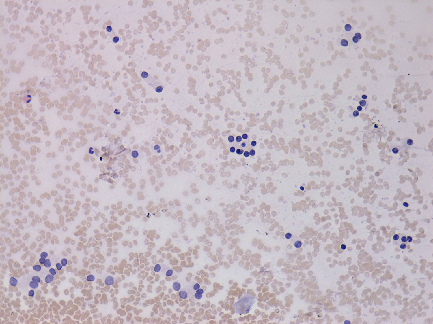 Pap-smear, 200x. Follicular cells present anisonucleosis: dark and small nuclei occur mixed with light and larger nuclei. There is a cell group in the center composed of 2 or 3 microfollicles.