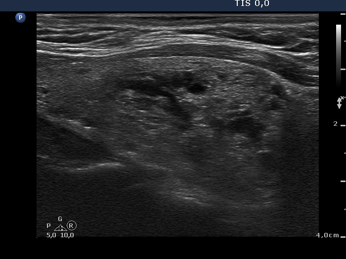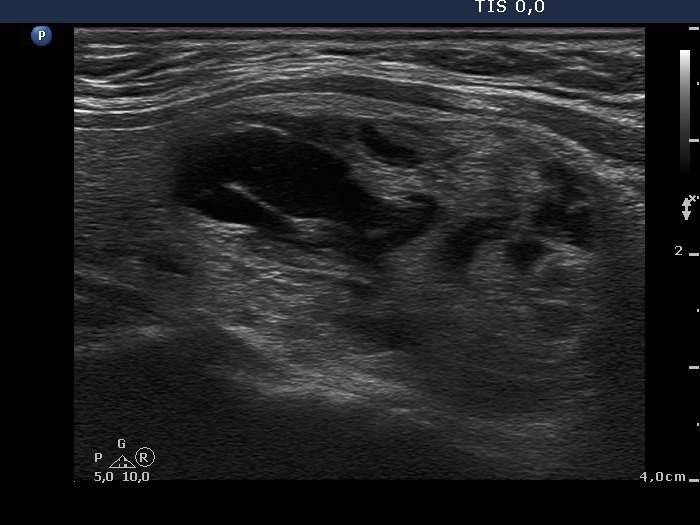 Final diagnosis: nodular goiter with not greater than 1% risk of malignancy. Considering the ultrasound presentation we told the patient that the risk of malignancy is not greater than 1% and offered regular follow-up examination.