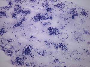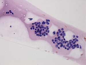 The cytological pattern is characteristic of hyperthyroidism. The sonographic presentation is characteristic of a toxic multinodular goiter because of the shrinkage of the contralateral lobe caused by the low TSH level.