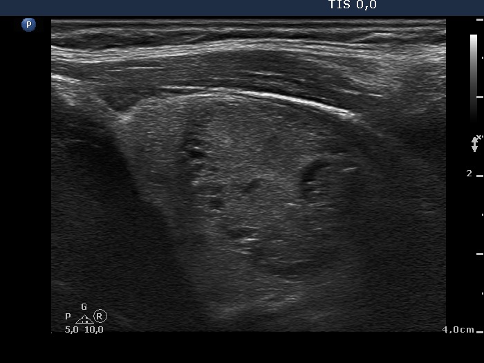 Ultrasonography. The right thyroid was significantly enlarged and contained multiple nodules with different echogenicity. The left thyroid was decreased in size and presented small insignificant lesions.