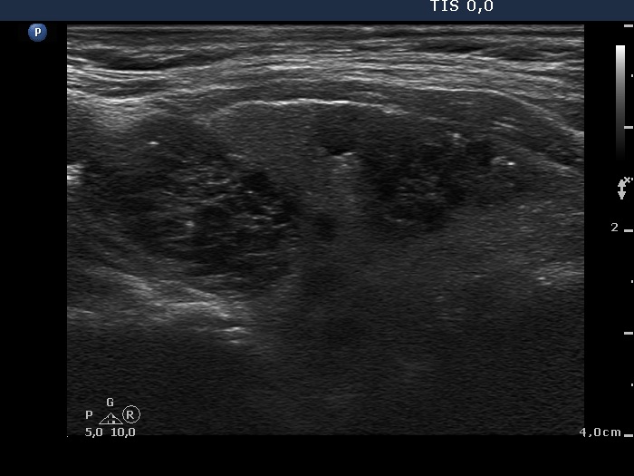 Cytology was performed from one of the mixed nodules in the right lobe and resulted in benign lesion corresponding to hyperthyroid goiter.