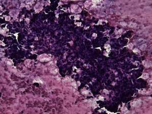 Cytological report: benign follicular proliferation (microfollicular proliferation without atypia, scanty amount of colloid in the background).