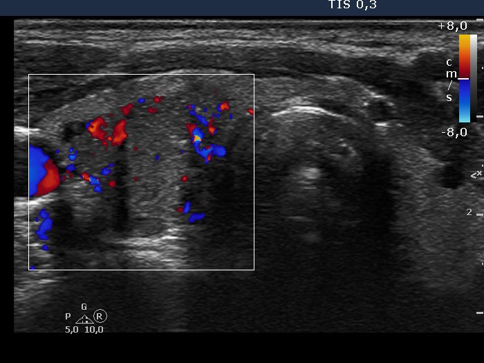 Ultrasonography. The thyroid was echonormal. There was a hypoechogenic nodule presenting irregular lobulated margin and intranodular hyperechogenic figures including microcalcifications. The nodule had an irregularly increased intranodular vascularization. A small, moderately hypoechogenic inhomogeneous lesion was found in the left lobe.