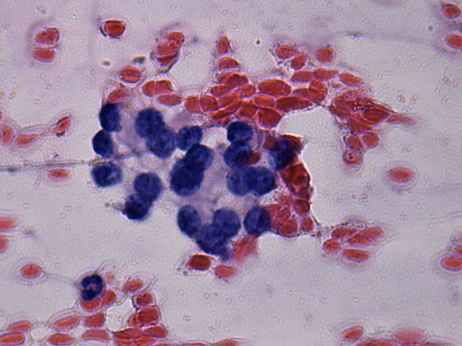Pap-smear, 1000x. Follicular cells are uniform is size and did not present any significant atypia.