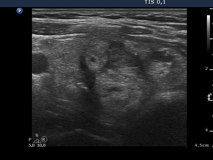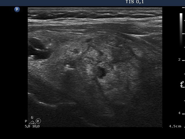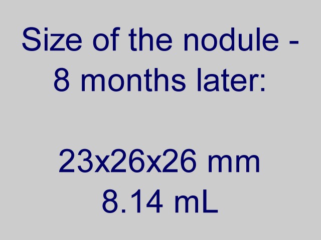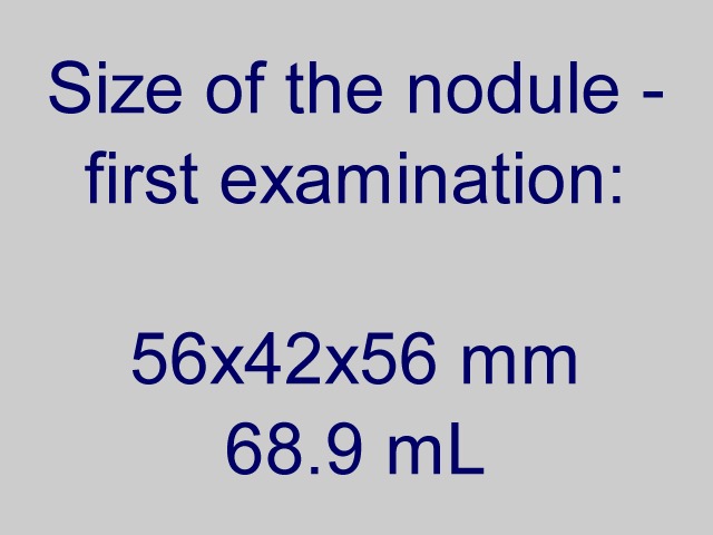 Palpation: the nodule in the right lobe was significantly smaller compared with first examination.