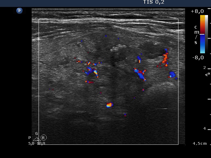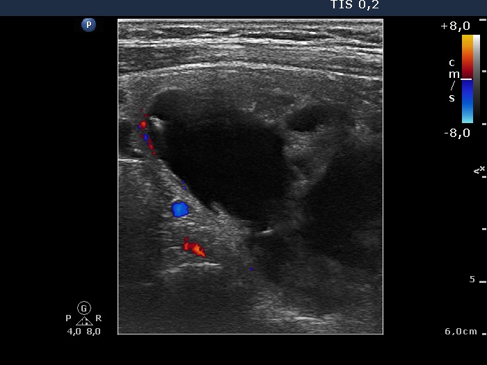 Ultrasonography. The thyroid was echonormal. A large mixed nodule was found in the right lobe. The solid part of the lesion was echonormal, and the nodule presented signs of a type 2 vascular pattern.