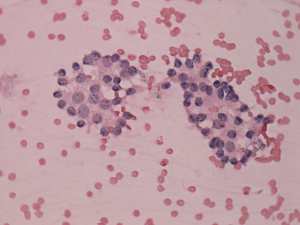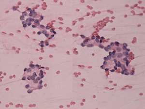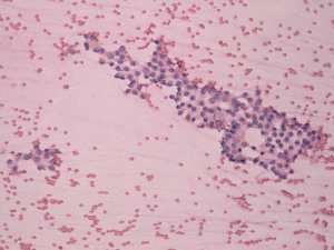 Cytology was performed form two lesions and resulted in benign colloid goiter and benign follicular proliferation. The images of the latter smear are demonstrated which was gained from a moderately hypoechogenic nodule in the left lobe.